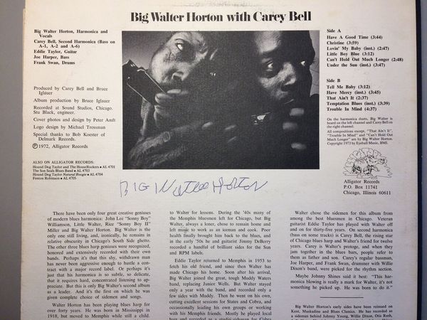In Feb., '79 I had the great fortune to see Big Walter Horton perform at Rohans Rockpile. It was an incredible show except for a harp player in the audience who played his C harp through every tune. Near the end of the show Walter said, "I can hear you out there playing that harmonica but you will never, NEVER play a harp like me!" I invited him to come over to my home for dinner the next day when he signed this album. We also dropped in on my late friend Portland Al at his record store and had this photo taken. Walter Horton was the best blues harmonica player I ever heard and was a really cool person.
