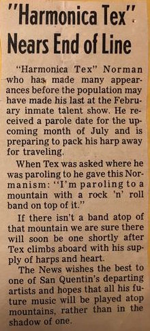 One of the best harmonica players I have ever heard was Harmonica 'Tex' Norman aka Harmonica Colt, aka Colton Coeur Demain, aka Eddie Norman. He spent most of his life behind bars for some offences including armed robbery. He escaped from 2 maximum security prisons and the second time was on the lamb for several years. When he was finally captured, the sheriff's deputies deliberately shattered one of his knees to end his escapes. Legend has it that he could make $500 in a couple hours of busking-playing his harp and singing. He hung out in the SF Bay Area, Tempe, AZ, Boulder, Colorado and other places unknown to me. In 6/72 I was visiting SF from my commune in Wolf Creek, Oregon, staying with a friend. I got a call there from one of my fellow Wolf Creekers who was also visiting friends in SF (Jackie Spear). She asked me to turn on the tv because her pal Harmonica Colt was going to be interviewed by Truman Capote from Colt's residence in San Quentin Prison. I eagerly turned on the tv set and watched Capote as he interviewed some of the prisoners. Each time the programme cut to commercial I heard this electrifying harp lick that stood my arm hairs on end-it was incredible! At the end of the show Capote finally interviewed Colt and it was amazing! As soon as the programme was over I got another call from Jackie asking if I would like to go with her to San Quentin to visit Colt. I accepted instantly and the next morning we went to the prison. I was not allowed to wear my own clothes for the visit and wore some 'rags' they kept there for that purpose. We sat in the visiting room and eventually Colt showed up. He regaled us with tales of his life that were spellbinding. I asked what he did while doing his time. He explained that he had been trained as a baker, an electrician and several other trades during his years of incarceration but these days the authorities left him alone to do whatever he wanted. He said he had a special room where he liked the echoing acoustics and he'd simply play his harps. He told me, "You should hear the ice cold licks bouncing off those walls!" I asked if I could send him a supply of harps but he said he had all he needed. We communicated via letter for a few years and he always mentioned coming to Vancouver to visit me but, of course, the border would never let a convicted felon across. In the early '80s I tried to track him down and eventually got in contact with a woman in the SF Bay Area he had been living with. She told me he had died years earlier and began to weep profusely. If anyone out there knows of this Truman Capote documentary in San Quentin (there were at least two of them) that showed on WNET or PBS (I believe) I would love to know about it. I have been unable to find any recordings of this harmonica genius-it is very possible that none exist.