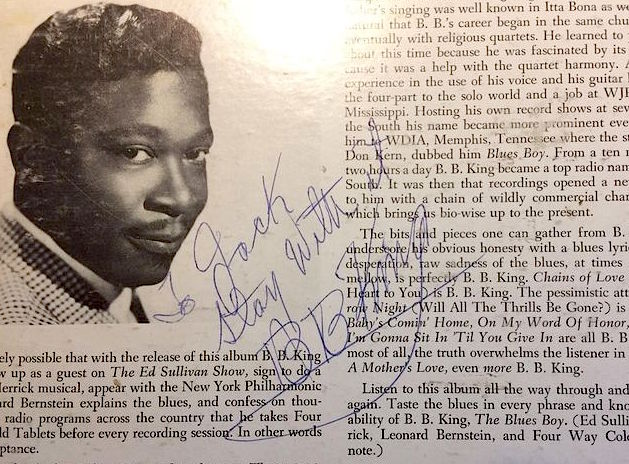In January of '79 Powder Blues opened for BB King at the Commodore Ballroom. I brought the oldest BB album I had for him to sign. He said he'd be happy to sign it and when I handed the album to him he chuckled and said he had not seen that one for a very long time-in fact, he said he did not own a copy! He was ever so warm and made me feel very welcome in his dressing room. I got to open several more shows for him over the years and he always made a point to say hi.